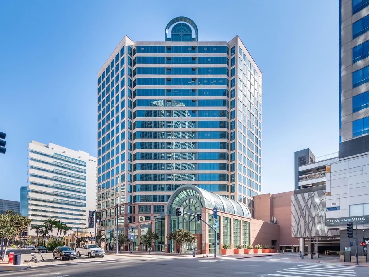 Con 21 plantas, el 501 West Broadway dibuja una silueta nítida contra el cielo azul y alberga empresas líderes como Pillsbury Winthrop Shaw Pittman y City National Bank.