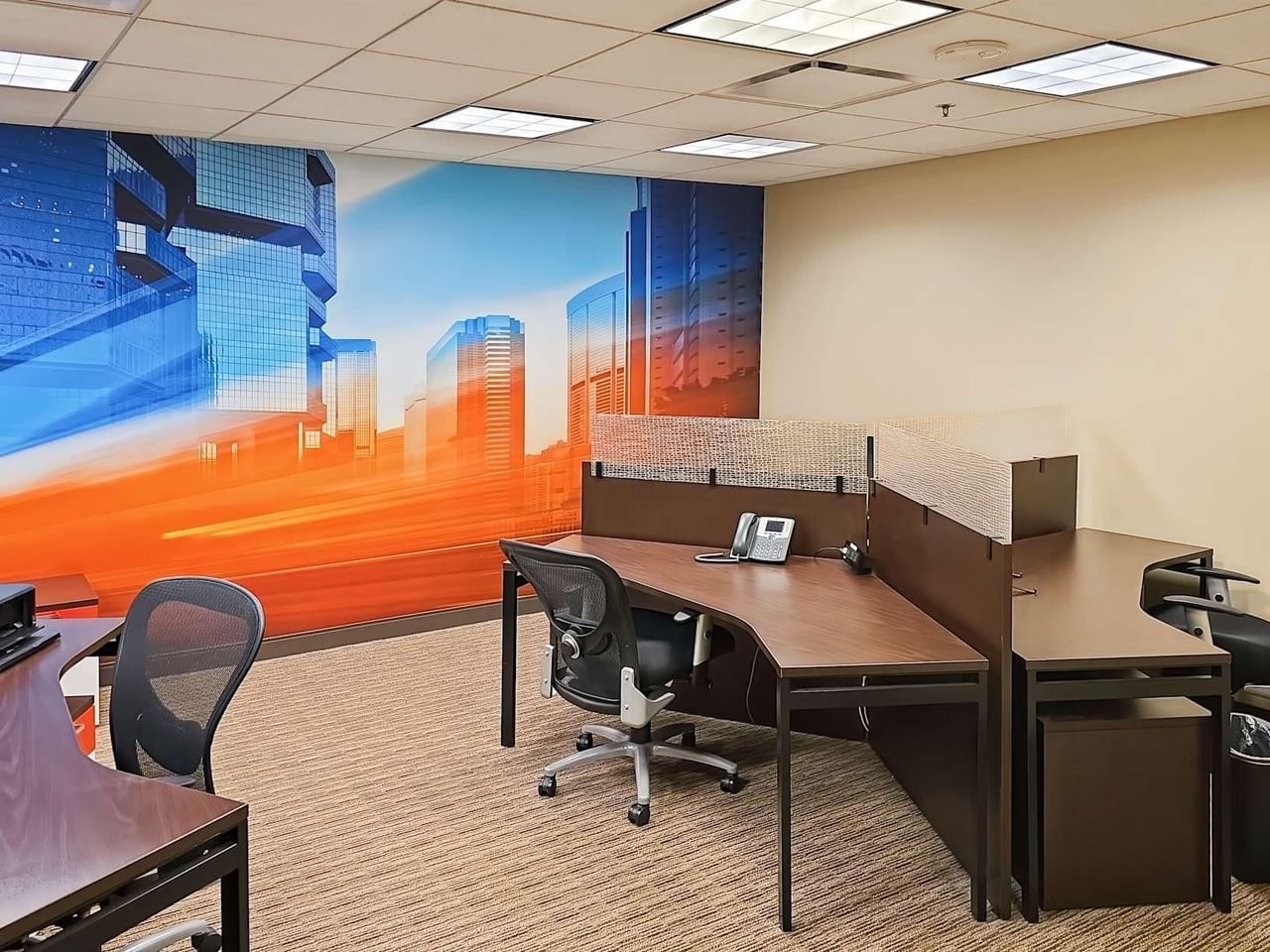 Una vista de las calles de la ciudad en estilo art decó adorna la entrada principal y el vestíbulo del Hub Tower Center, creando una impresión duradera entre los profesionales de este céntrico distrito empresarial.