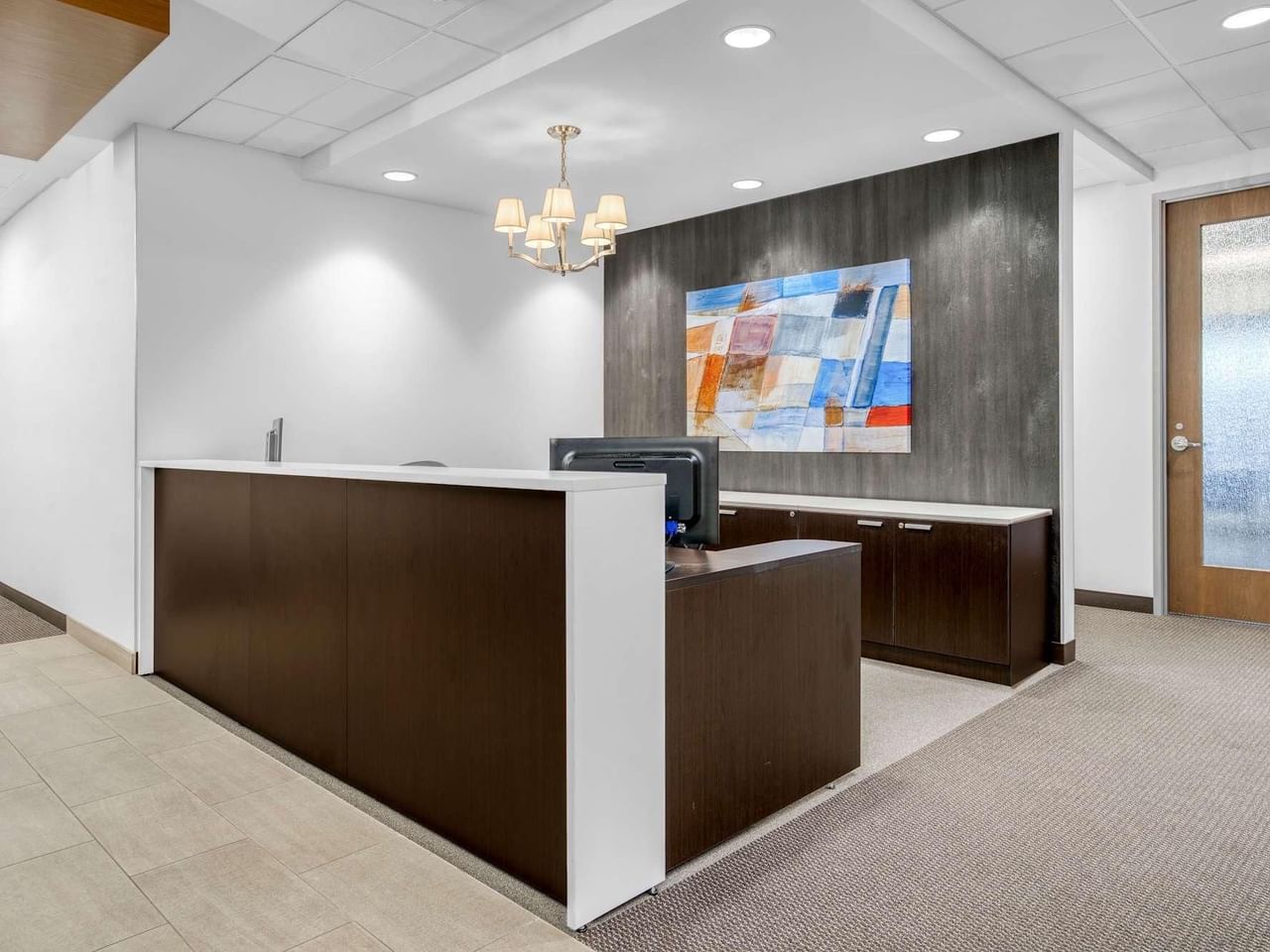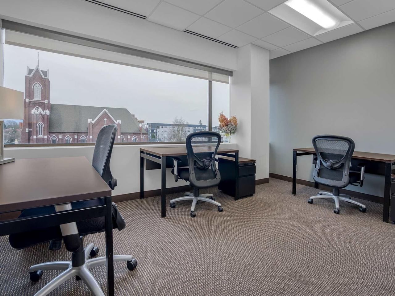 Las modernas oficinas, amuebladas con colores neutros, le permiten poner su sello en el espacio, mientras que los grandes ventanales dejan entrar la luz y ofrecen vistas del centro de la ciudad y de las montañas Cascade.