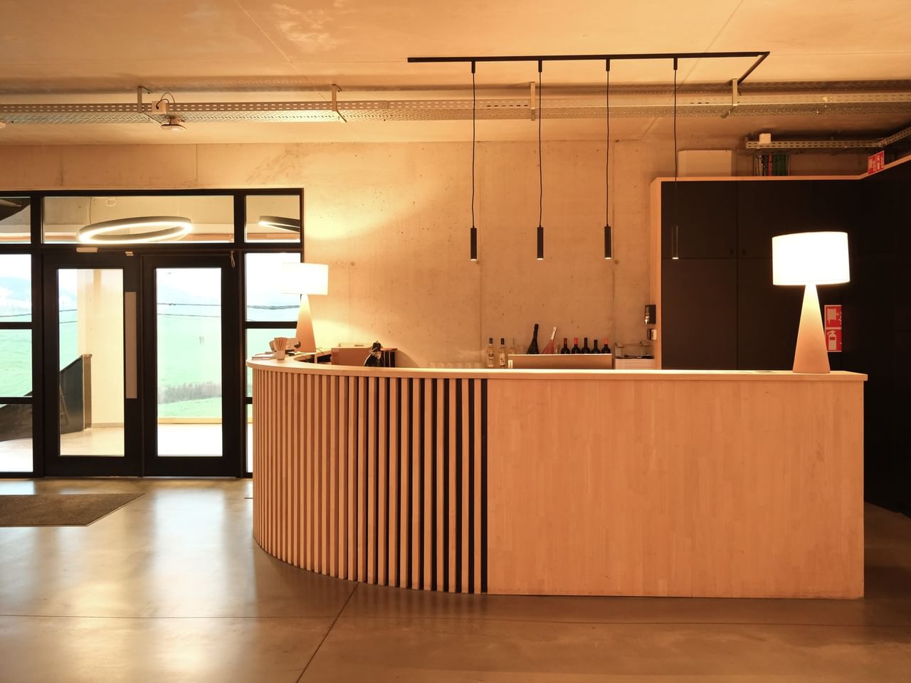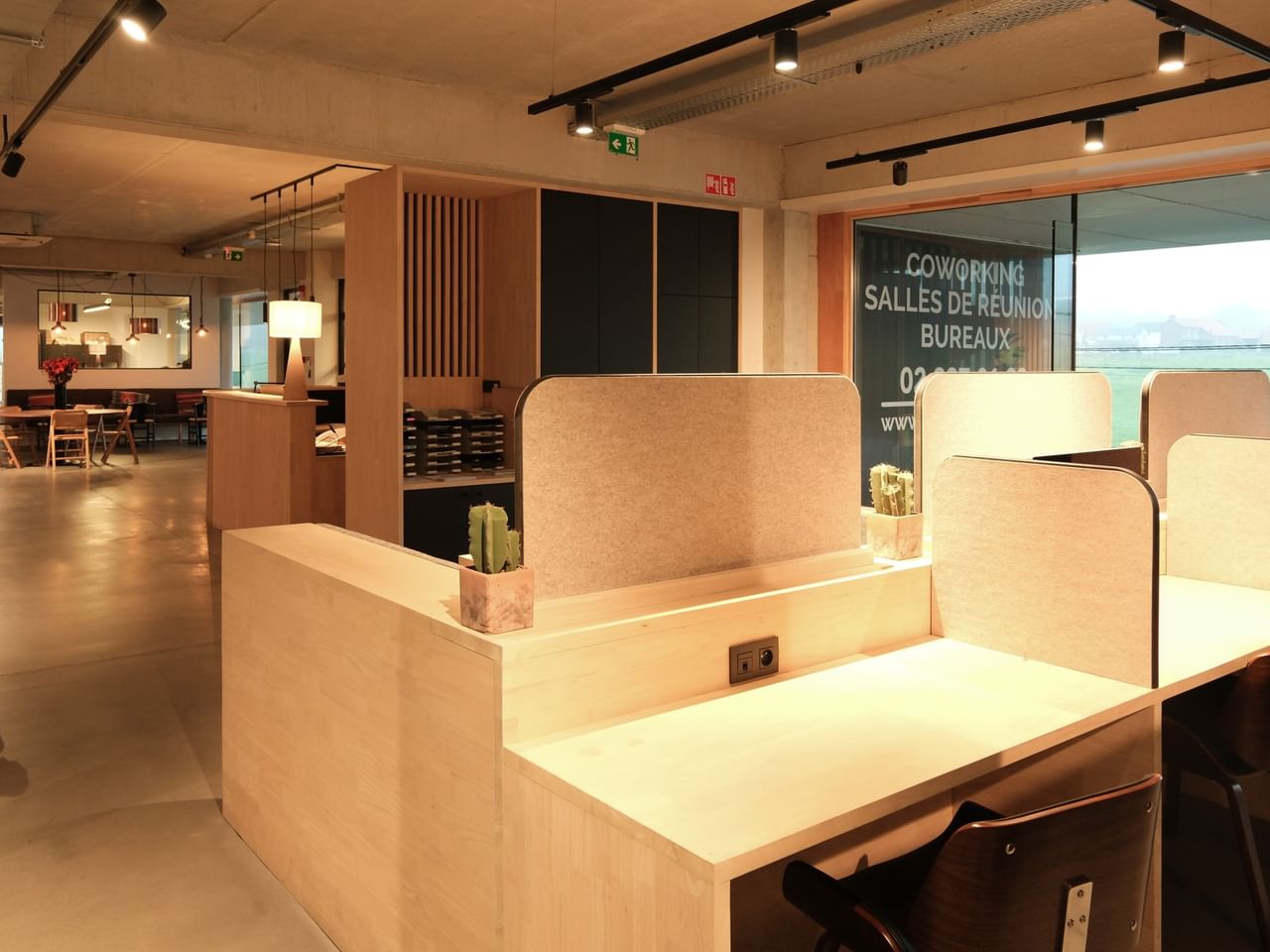 Voor het ontwerp van onze coworking space wilden we de voorkeur geven aan ruwe materialen zoals beton en hout om in harmonie te zijn met de industriële omgeving waarin we gevestigd zijn. Het hout zal eerder zijn bewerkt in de achterliggende werkplaats.