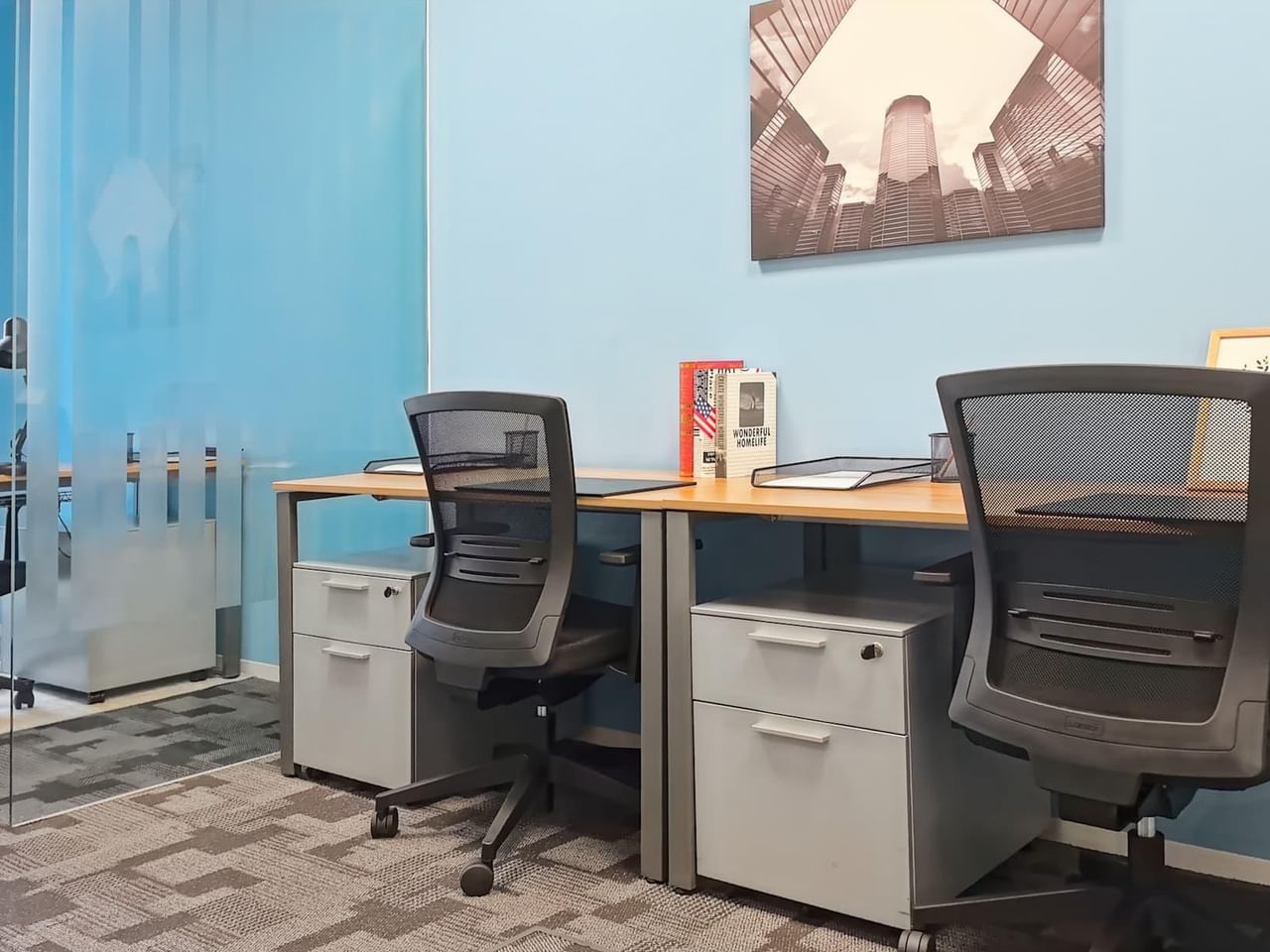 Werk productief in een stijlvolle omgeving, met smaakvol meubilair en uitzicht op de stad vanuit ramen van vloer tot plafond.