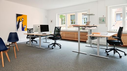 Alle bureaus zijn uitgerust met bureaus, stoelen, laptopstandaards, muis en toetsenbord.