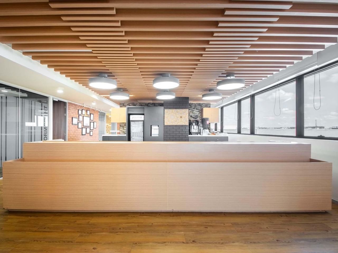 Een chique houten plafond, moderne witte bureaus en felgekleurde banken benadrukken misschien de stijl.