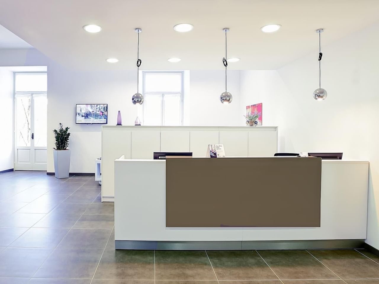 Maak indruk op gasten met de prachtige gevel voordat je zaken doet in de stijlvolle moderne werkruimte binnen.