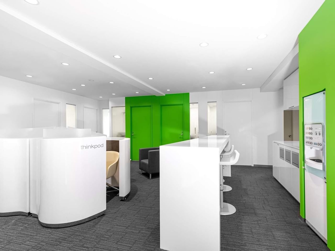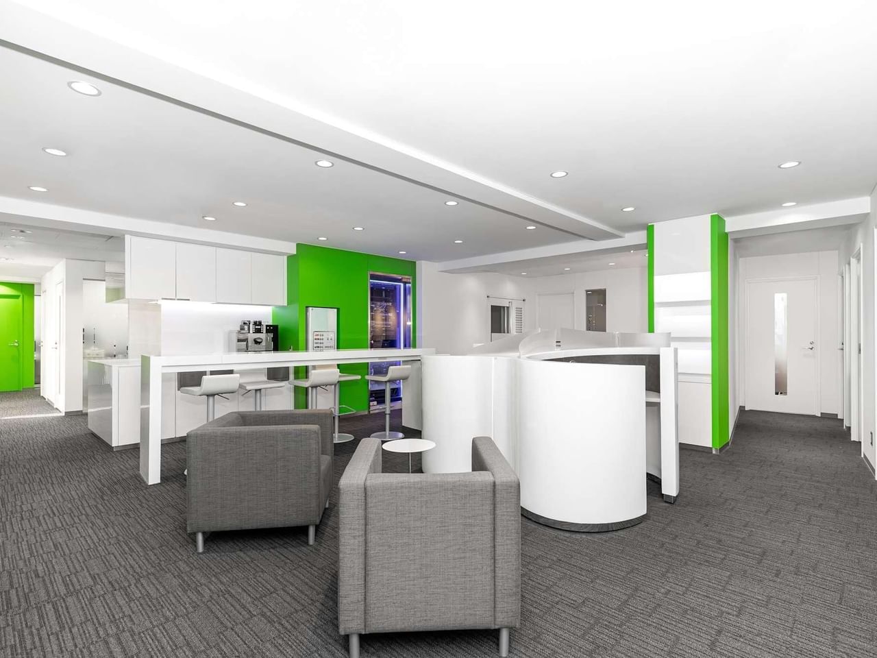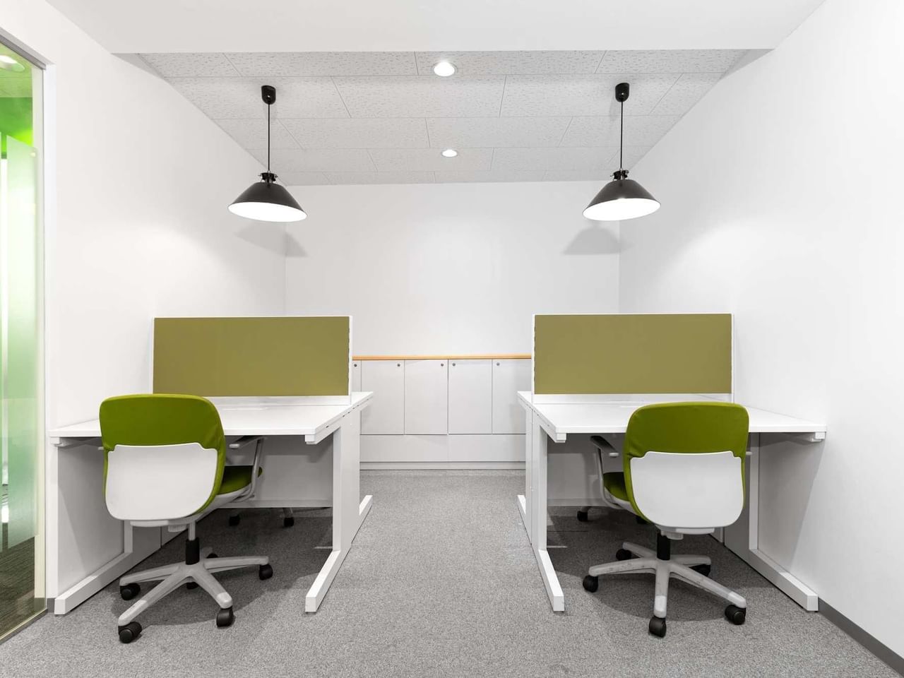 De groene vlekken rond het kantoor geven deze eigentijdse, volledig gemeubileerde ruimte een levendige uitstraling.