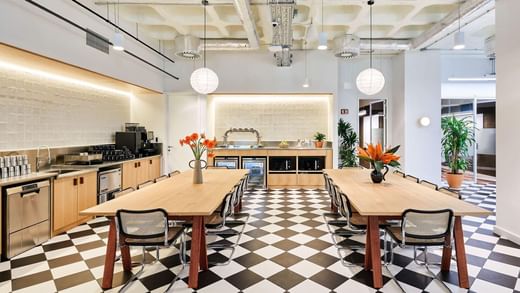 Onze leden hebben toegang tot telefooncellen, verschillende loungeruimtes, een buitenterras en een volledig uitgeruste keuken met gratis koffie, thee en vers fruit.