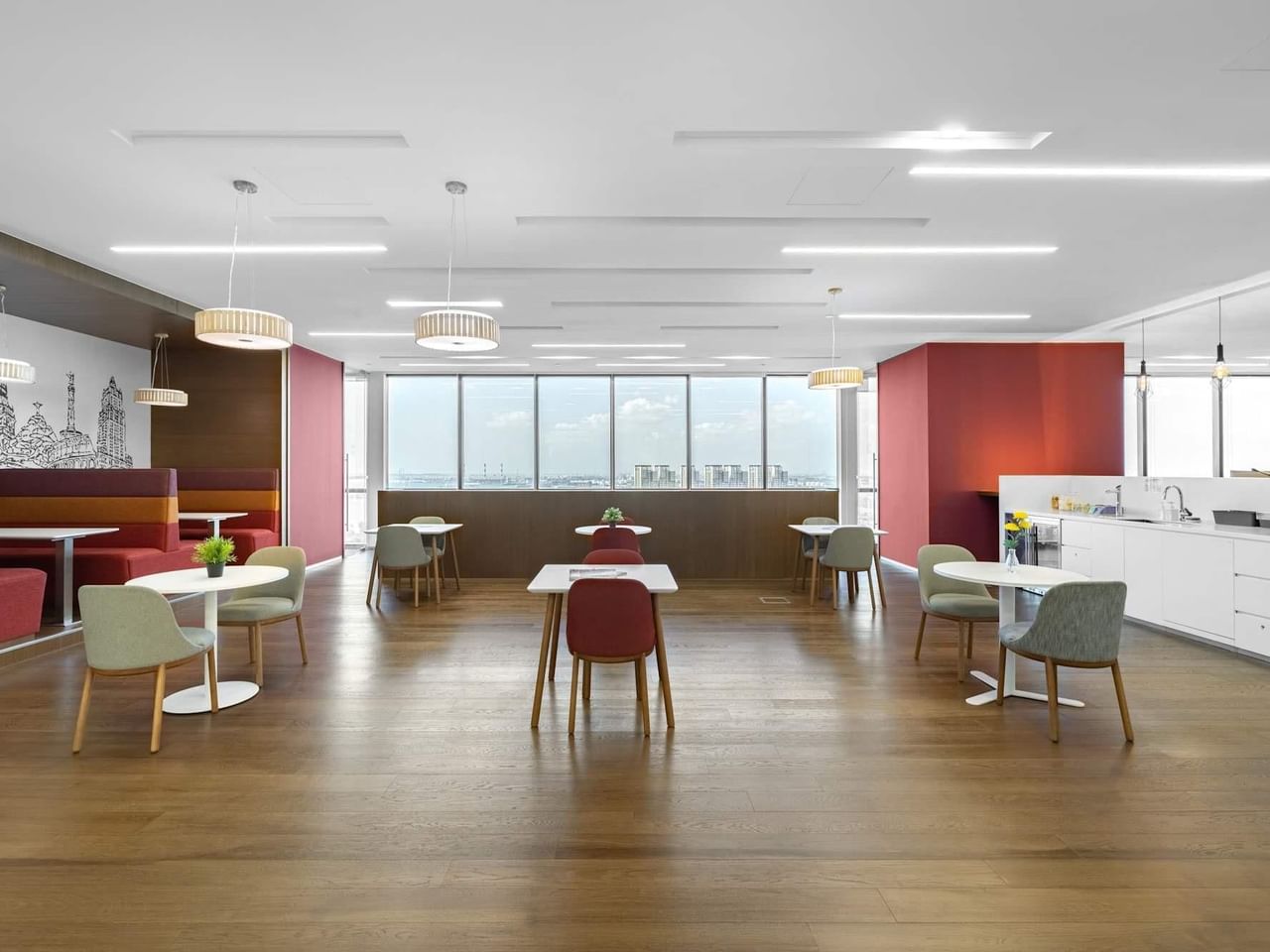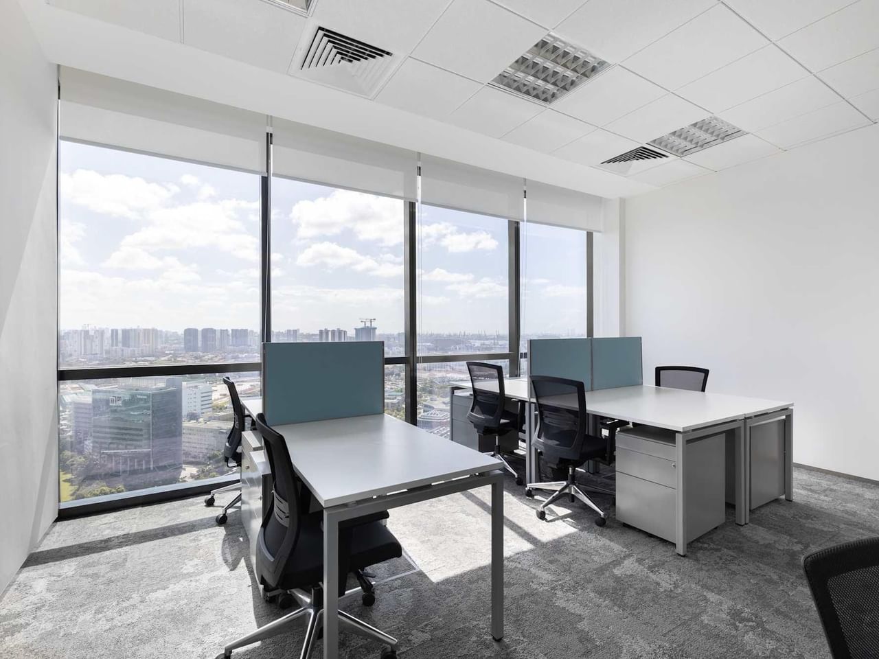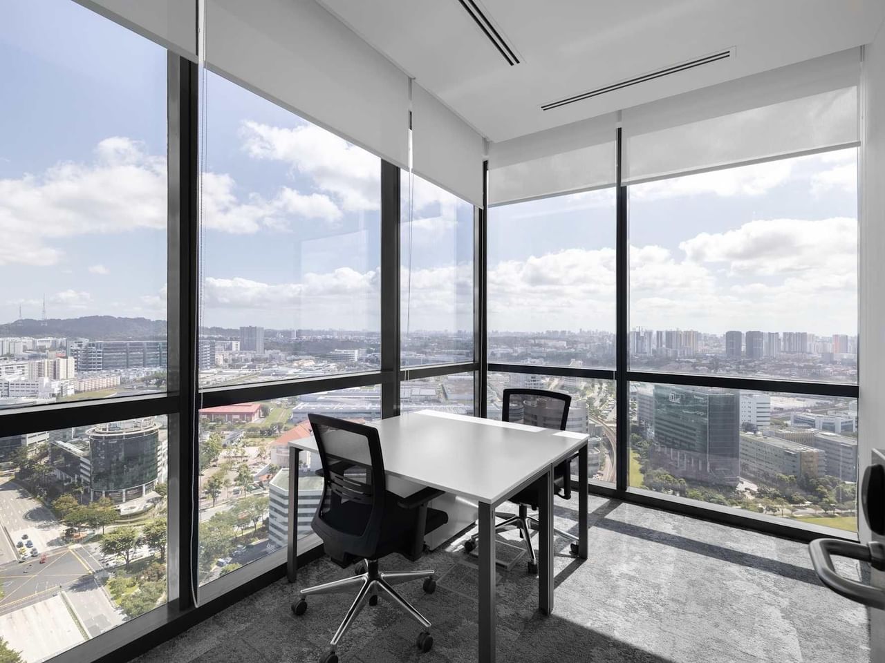 Vision Exchange biedt een ongelooflijk uitzicht op Jurong Lake en de skyline van Singapore, vanuit een moderne, lichte kantooromgeving.