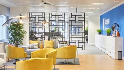 Geniet van een ontspannen werkomgeving, vol natuurlijk licht en ontworpen met een modern grijs interieur en plafonds met zichtbare buizen.