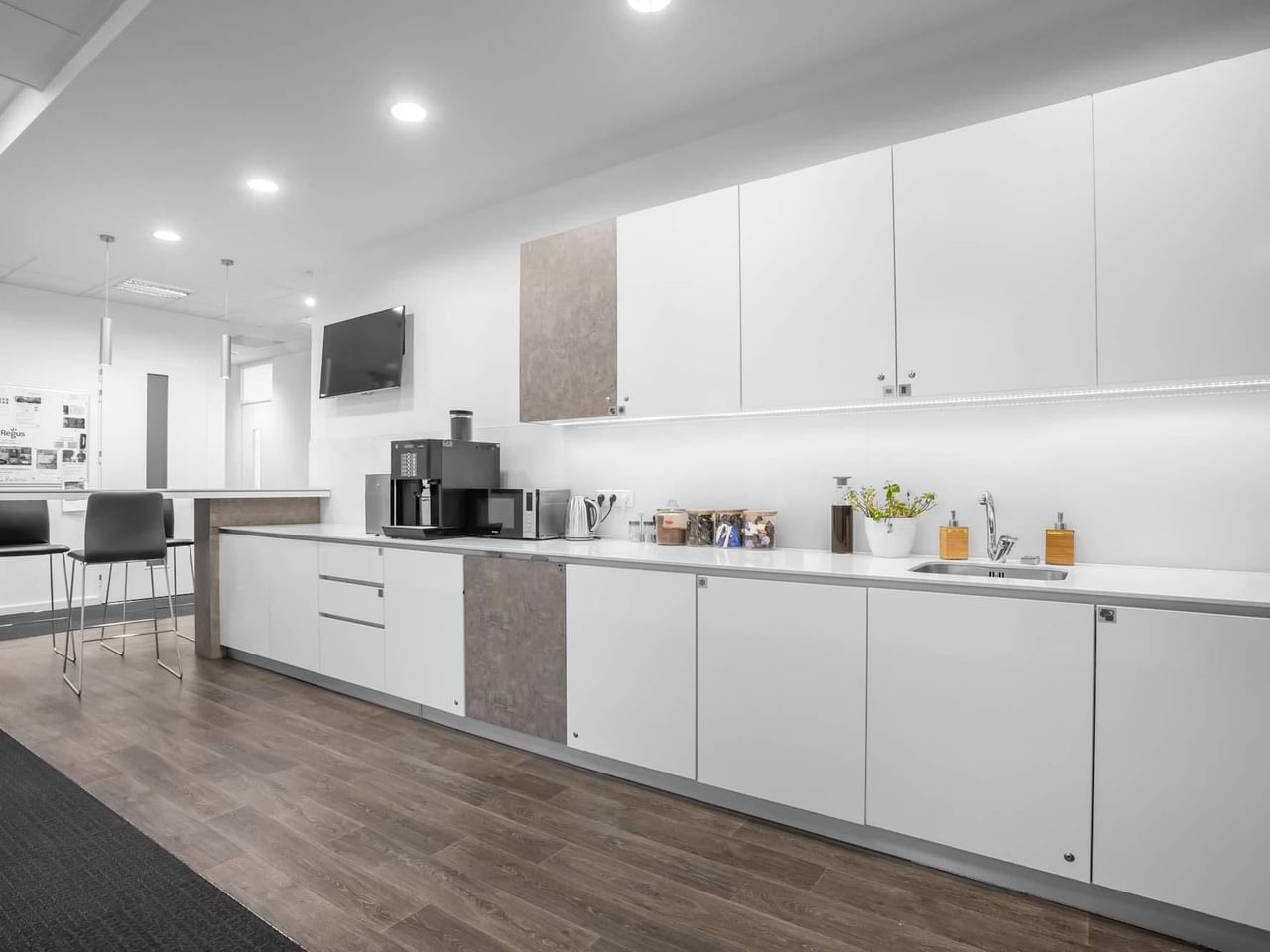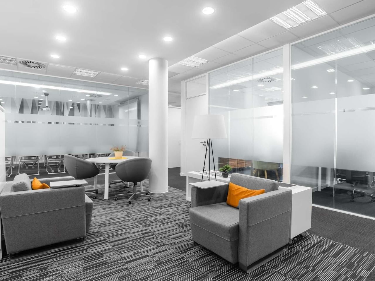 Werk in stijl vanuit een moderne werkruimte met modern meubilair en een comfortabele business lounge, ideaal om je e-mails bij te werken.