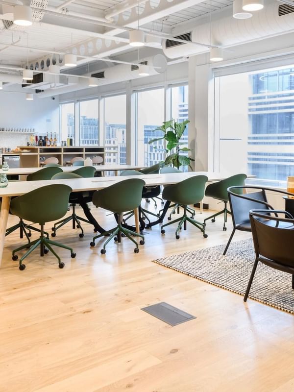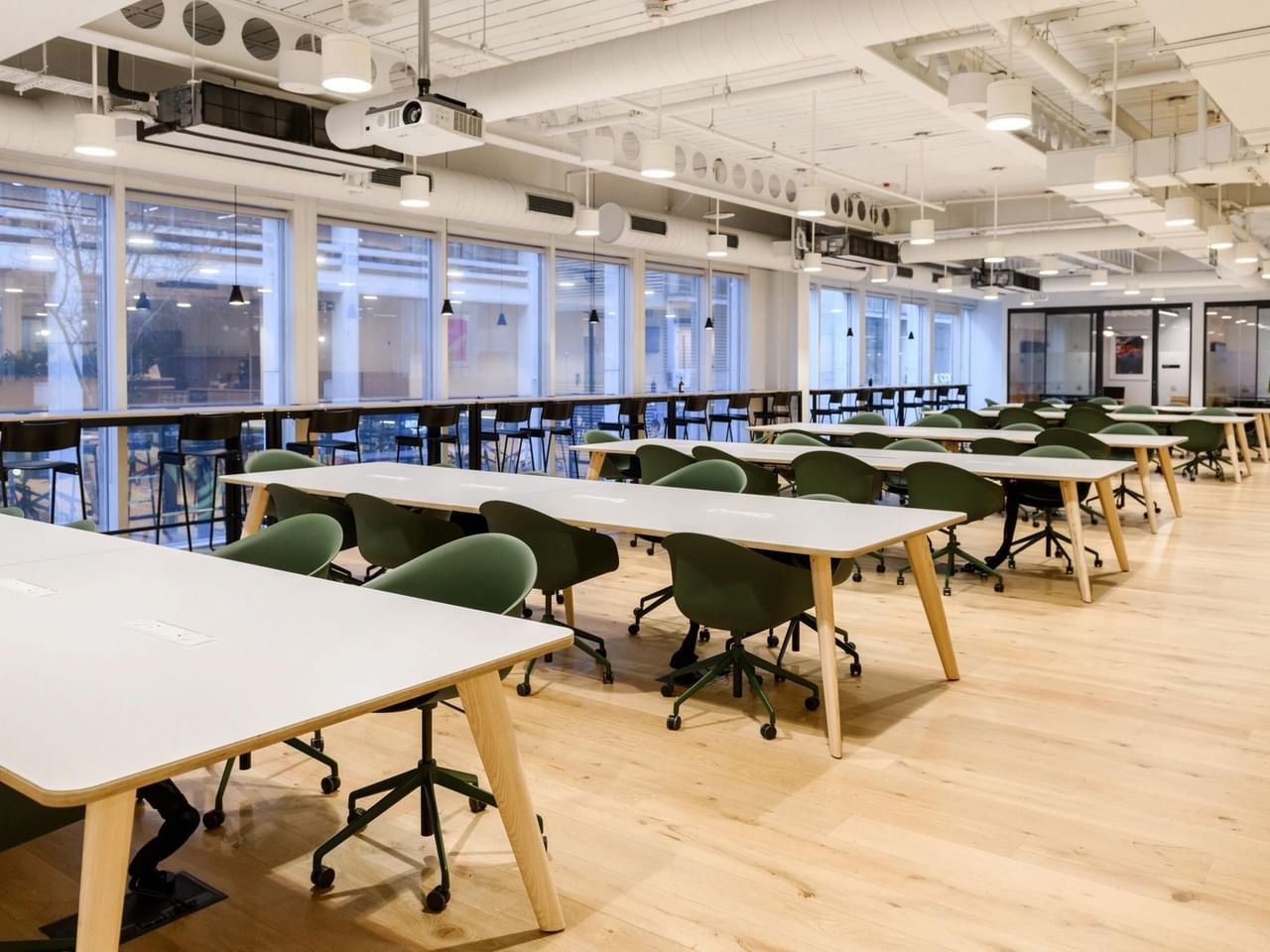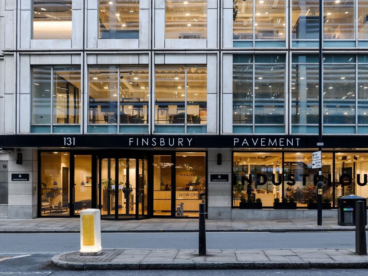 Industrious op 131 Finsbury Pavement, ideaal gelegen nabij Liverpool Street station en de open groene ruimte op Finsbury Square, biedt opties voor coworking en privékantoren voor kleine tot grote teams in het hart van Londen.