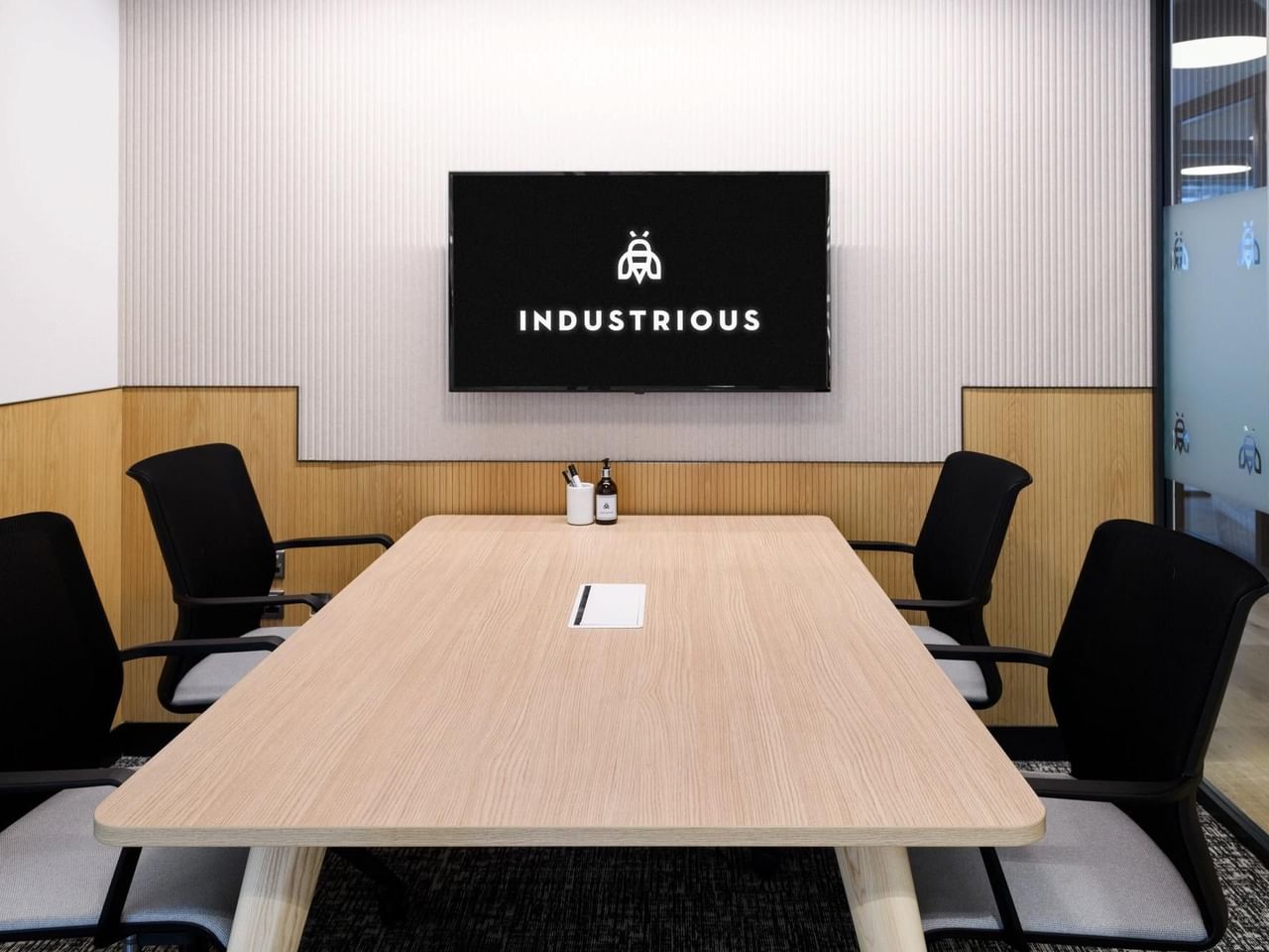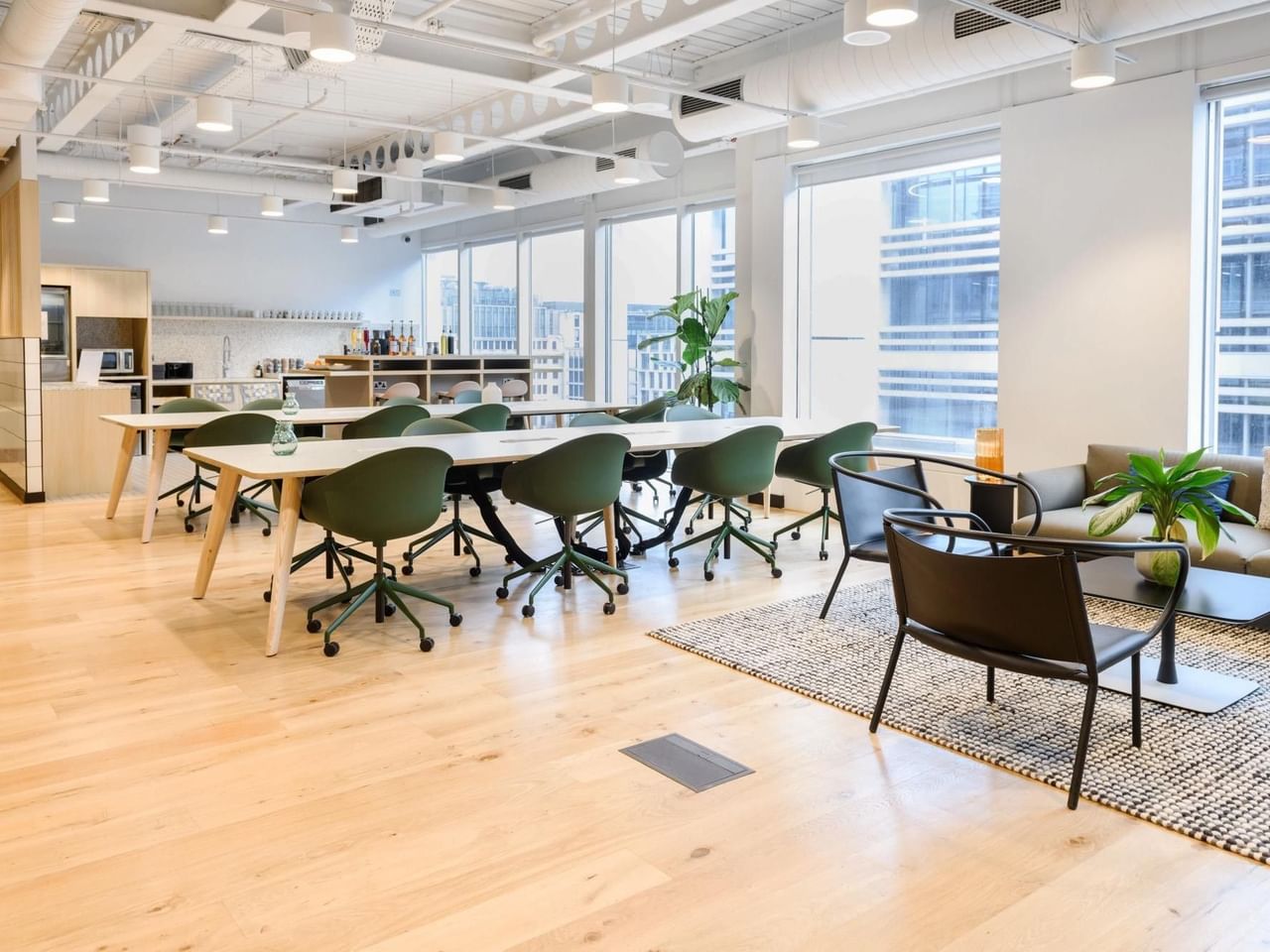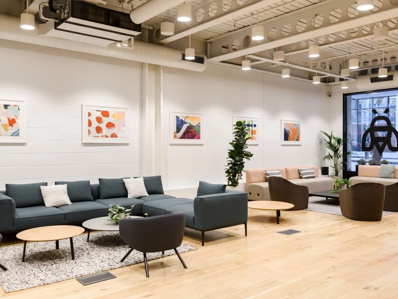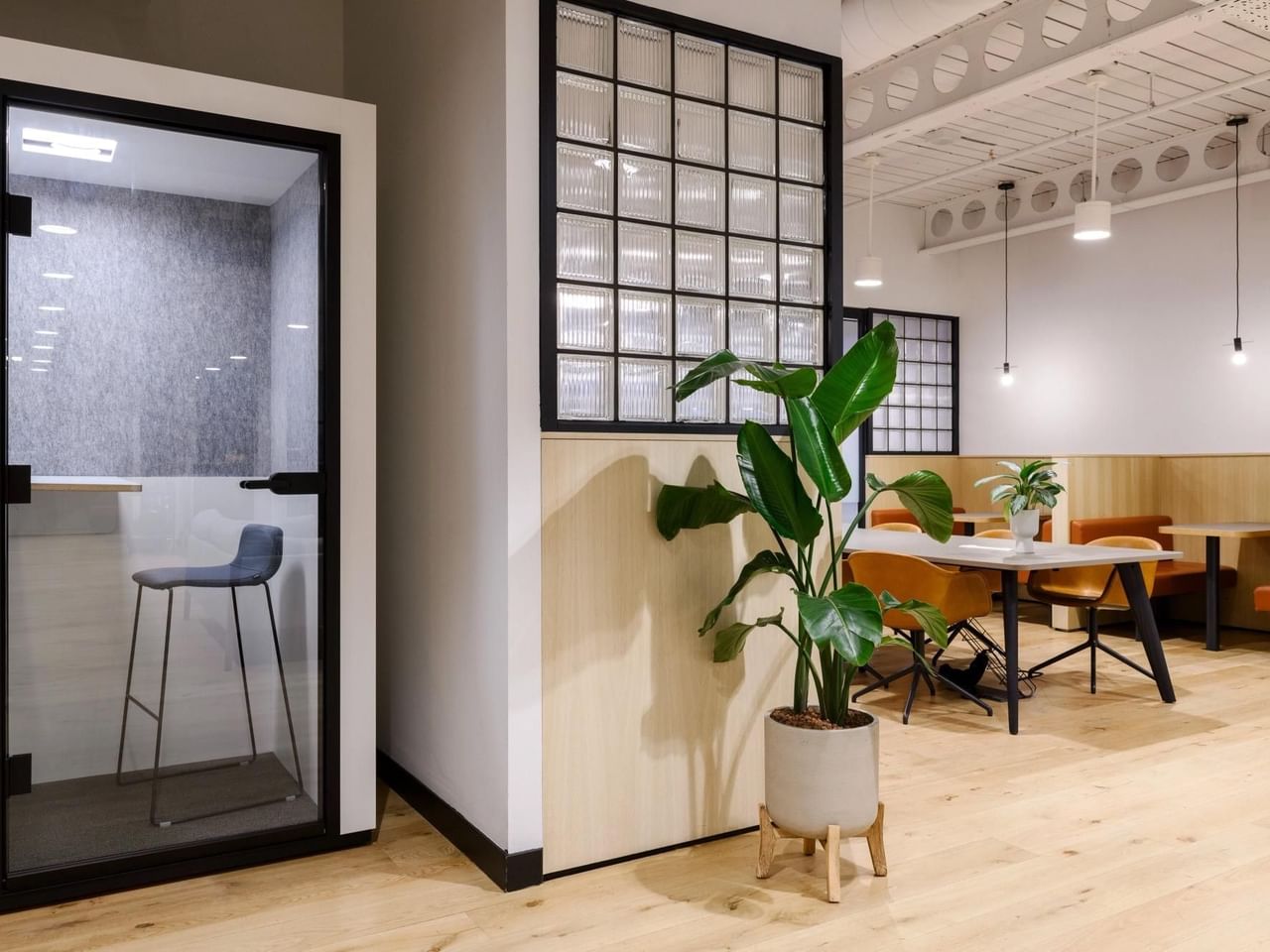 In de Industrious-ruimte kunnen leden gebruikmaken van verschillende ruimtes, waaronder lounges, vergaderruimtes, telefooncellen, een café en meer.
