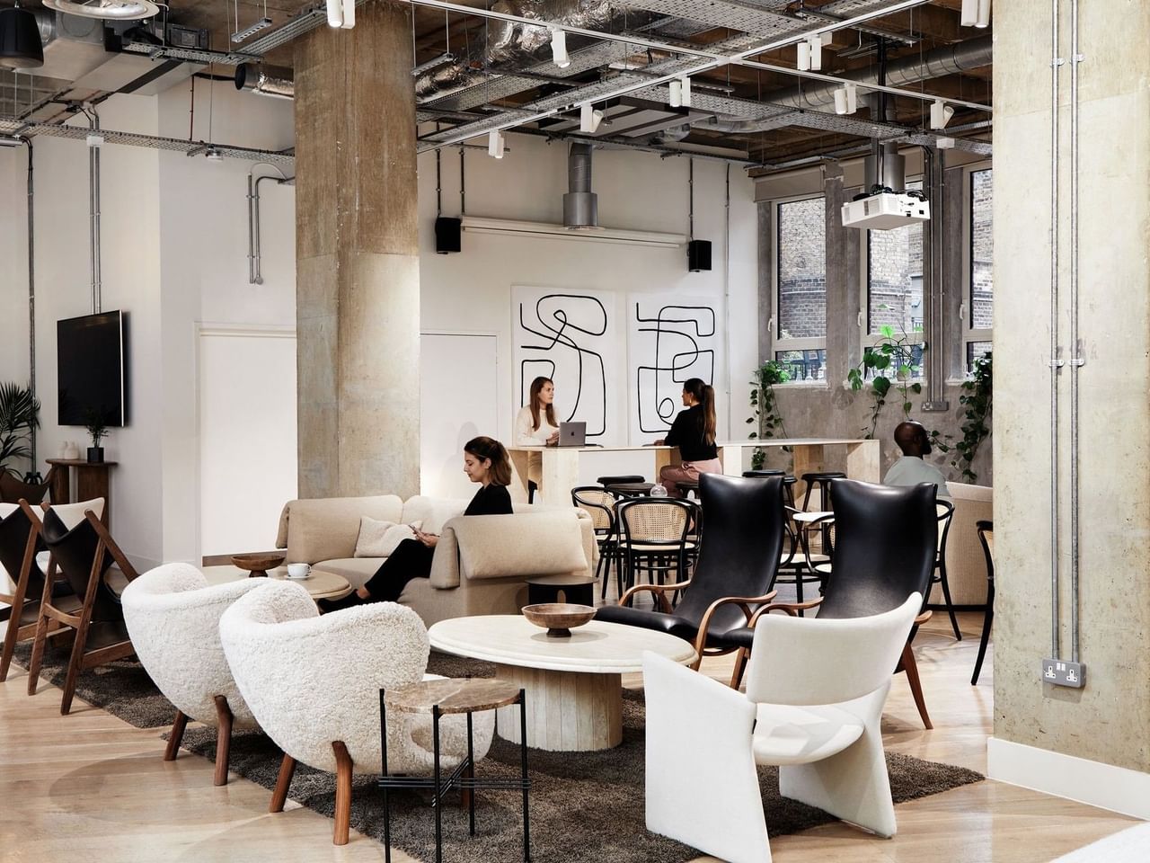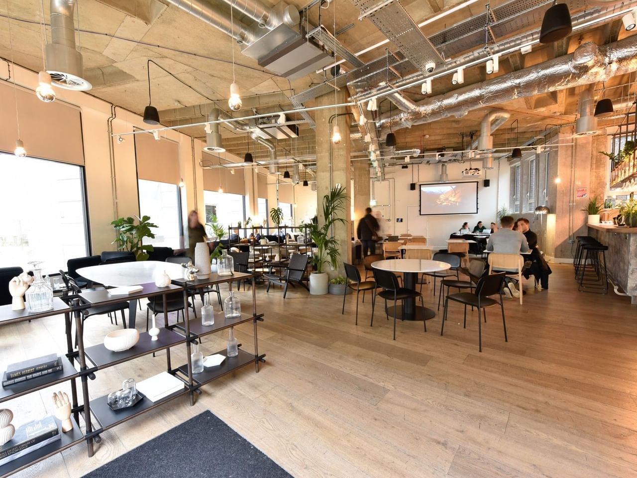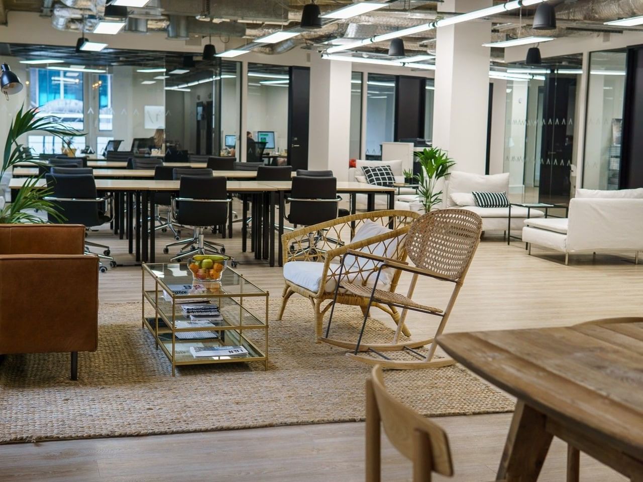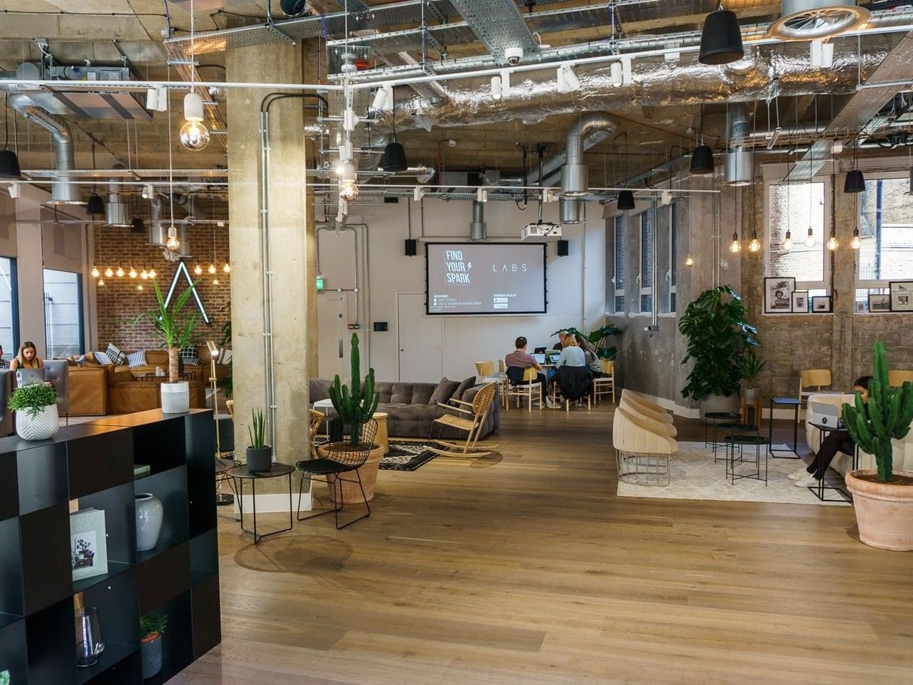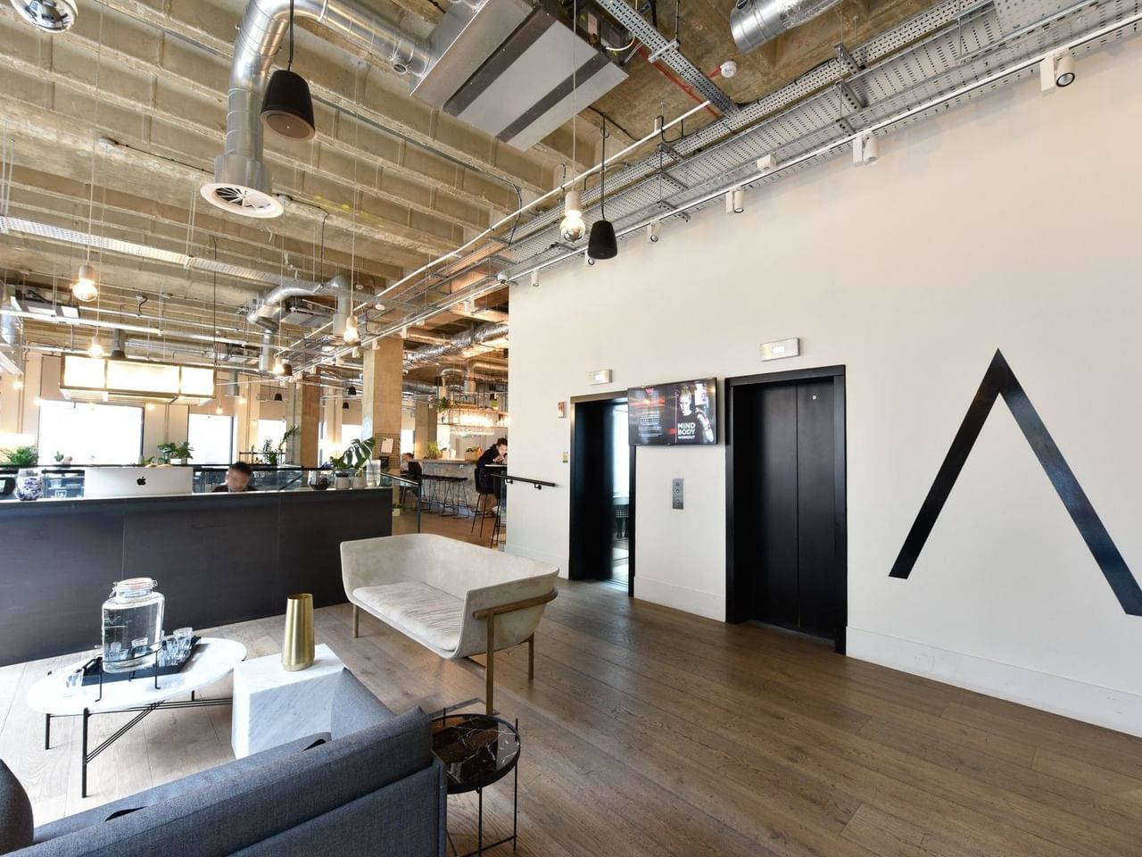 Een lichte en luchtige gemeenschappelijke loungeruimte met ramen van vloer tot plafond verwelkomt mensen in dit indrukwekkende gebouw, waar ook een café en bar zijn die de hele dag door koffie, heerlijk eten en een verscheidenheid aan cocktails serveren. Daarboven bevinden zich vijf verdiepingen met werkruimte, waaronder privékantoren, ontspanningsruimten en goed ingerichte keukens, allemaal overspoeld met daglicht.
