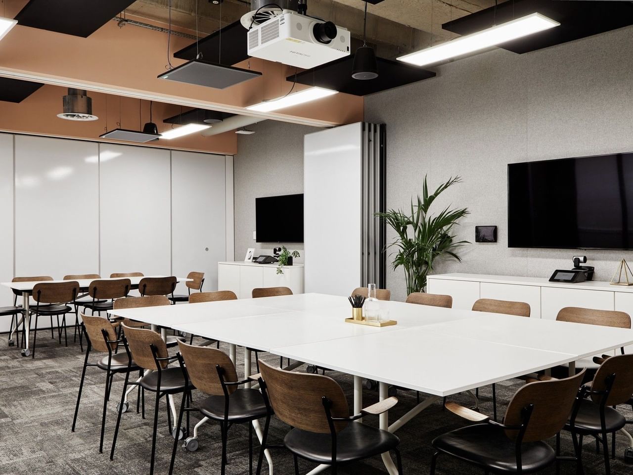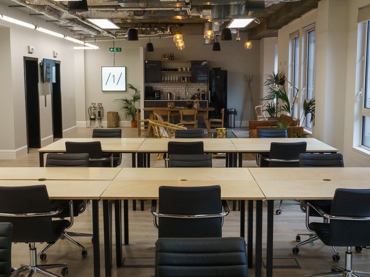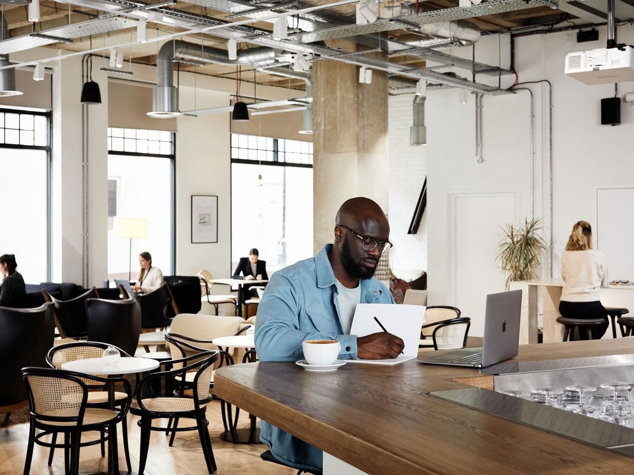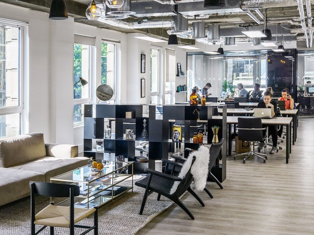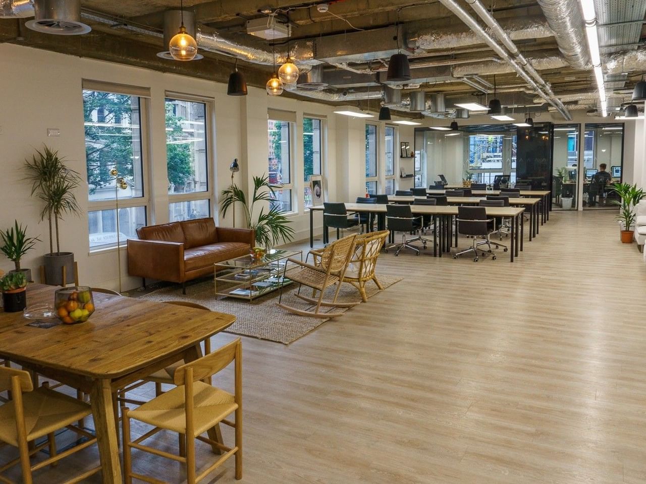 Een lichte en luchtige gemeenschappelijke loungeruimte met ramen van vloer tot plafond verwelkomt mensen in dit indrukwekkende gebouw, waar ook een café en bar zijn die de hele dag door koffie, heerlijk eten en een verscheidenheid aan cocktails serveren. Daarboven bevinden zich vijf verdiepingen met werkruimte, waaronder privékantoren, ontspanningsruimten en goed ingerichte keukens, allemaal overspoeld met daglicht.