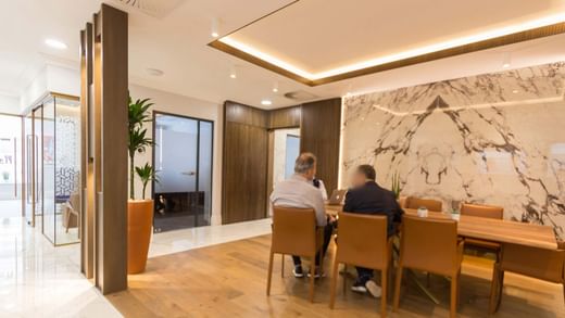 Netwerk met gelijkgestemde ondernemers in de elegante businessclub en receptie, compleet met comfortabele banken en opvallende verlichting.