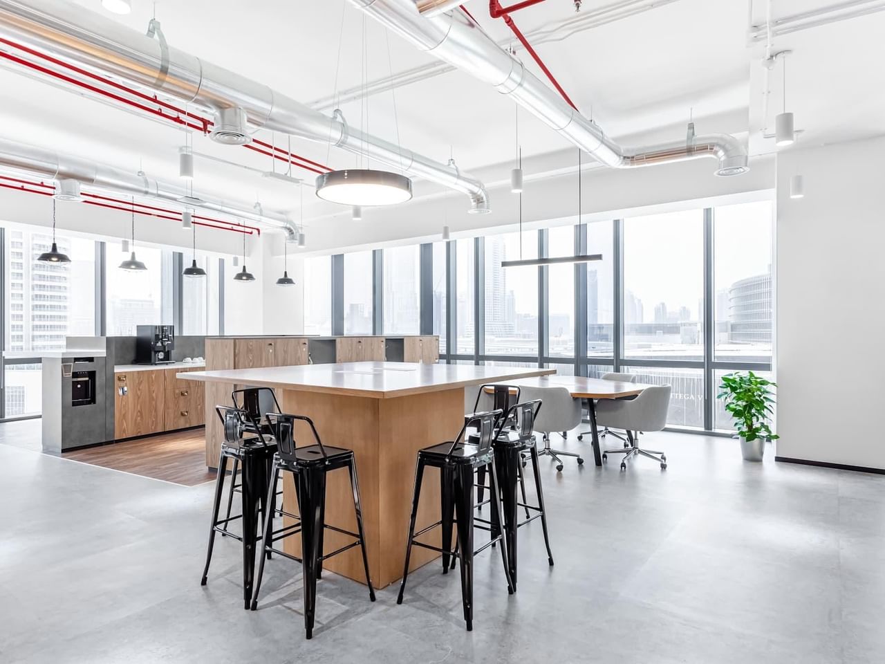 Werk productief in de ruime omgeving met veel daglicht en praat informeel bij in de loungeruimte.