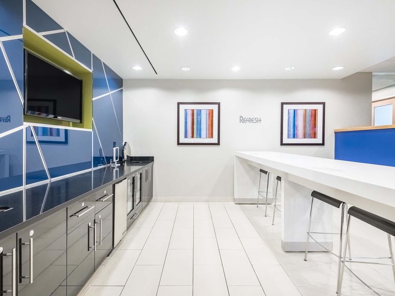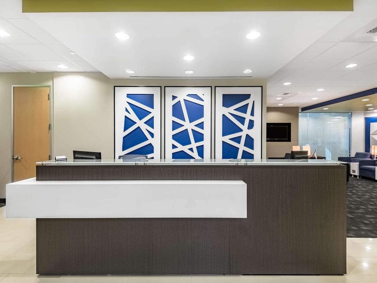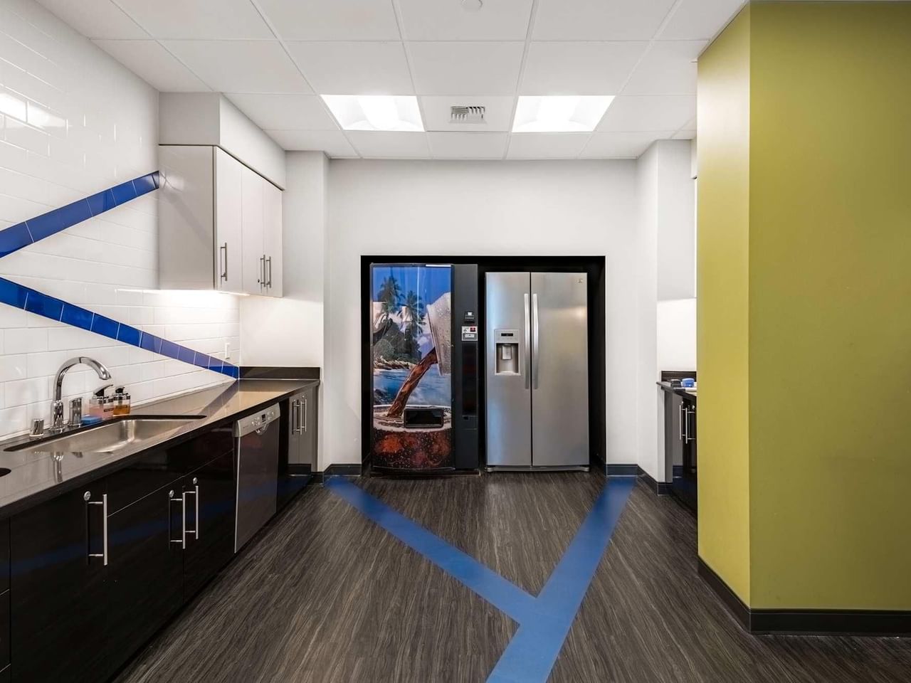 Het met palmbomen omzoomde gebouw is aan de buitenkant aquamarijnblauw, maar het interieur is een verkwikkende mix van koningsblauwe en limoengroene accentmuren, gecontrasteerd met oogverblindend witte werkplekken en zwarte fauteuils.