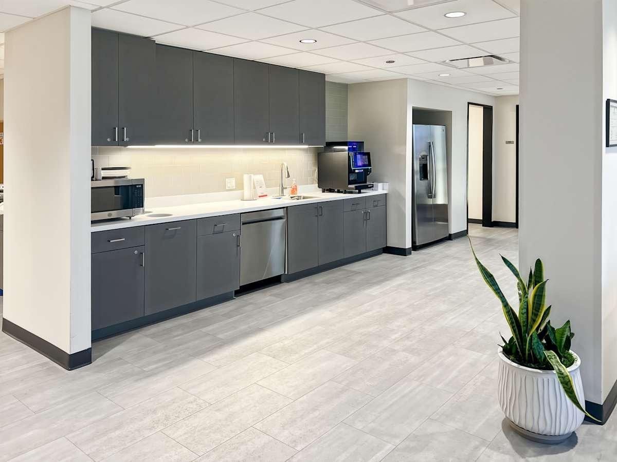 Praat bij met collega's onder het genot van een barista-koffie uit de volledig gevulde keuken.