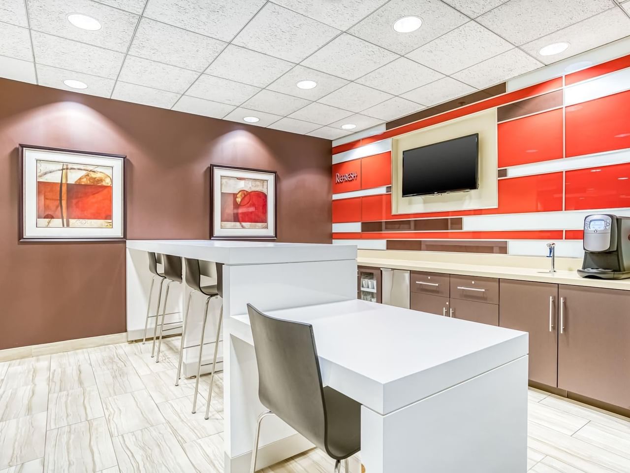 Met het eigen café, de gezellige business lounge en de moderne keukenfaciliteiten is het gemakkelijk om bij te tanken en met klanten te praten in een comfortabele omgeving.