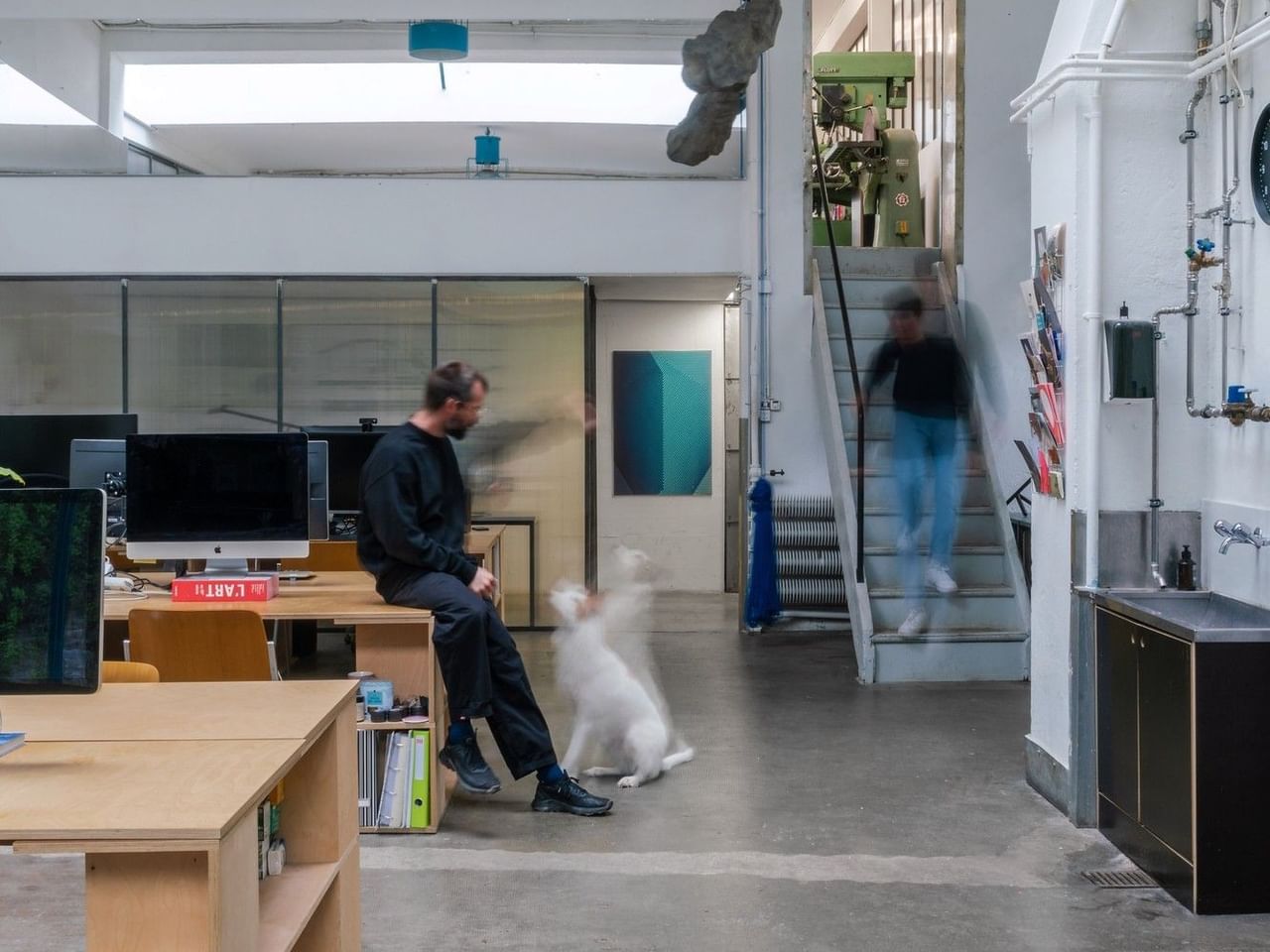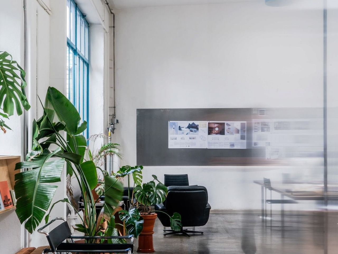 Zachte, natuurlijke zenitale verlichting baadt in de hele ruimte en creëert een kalme, inspirerende sfeer die ideaal is voor kantoorwerk, concentratie en creativiteit.