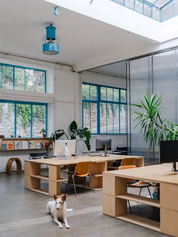 Deze gedeelde kantoorruimte is gevestigd in een voormalige blikfabriek en biedt een uitzonderlijke werkomgeving van 150 m², met een plafondhoogte van 4 meter.
