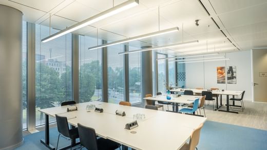 As grandes janelas frontais e o estilo arquitetónico tipo loft da era Wilhelminiana proporcionam aos modernos escritórios, salas de reuniões e áreas comuns boas vistas e uma agradável luz do dia.