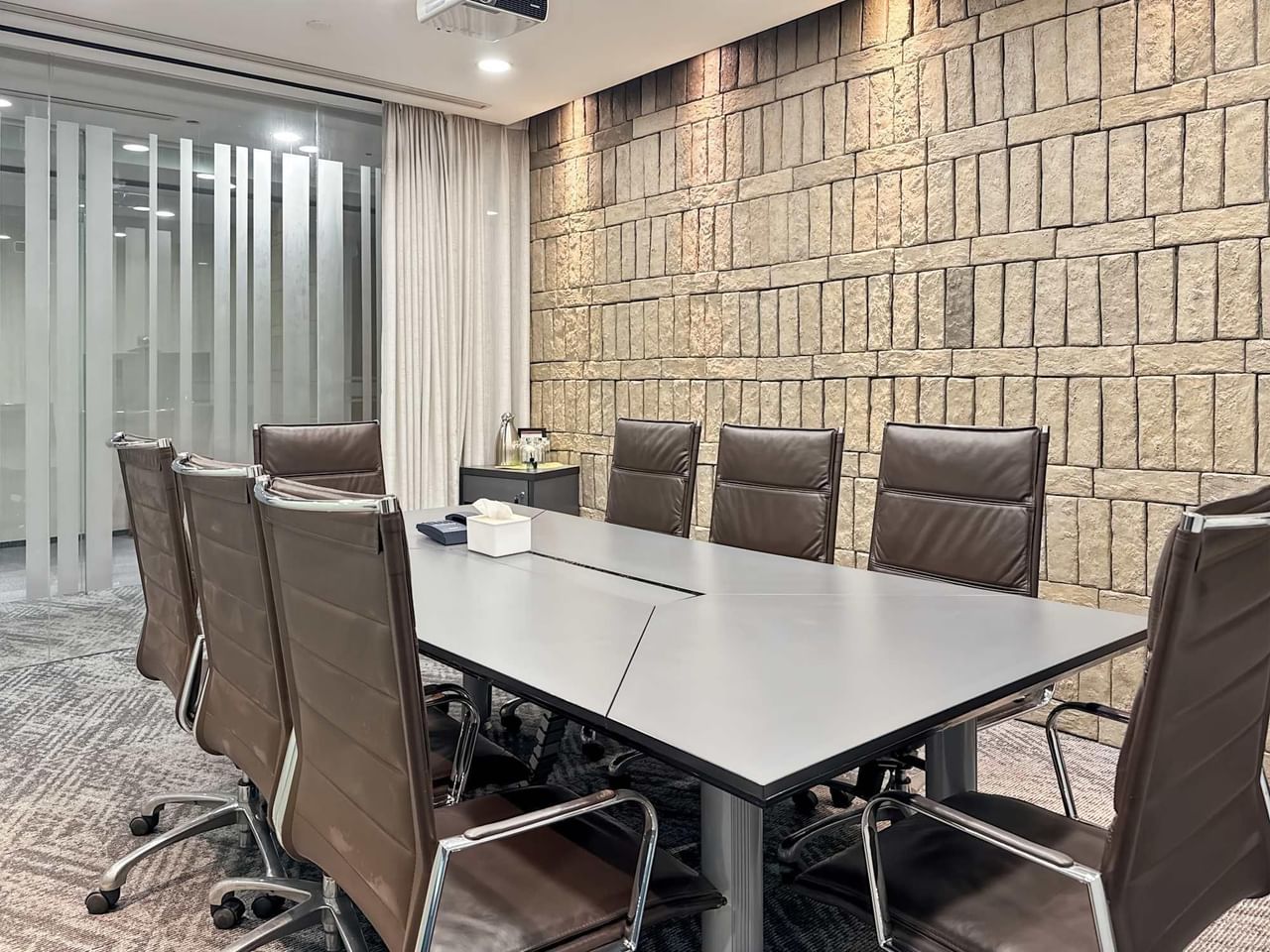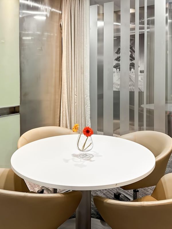 Organize reuniões improvisadas no nosso salão de negócios, apresente sessões remotas a partir do nosso estúdio de videoconferência e descontraia no café no local.