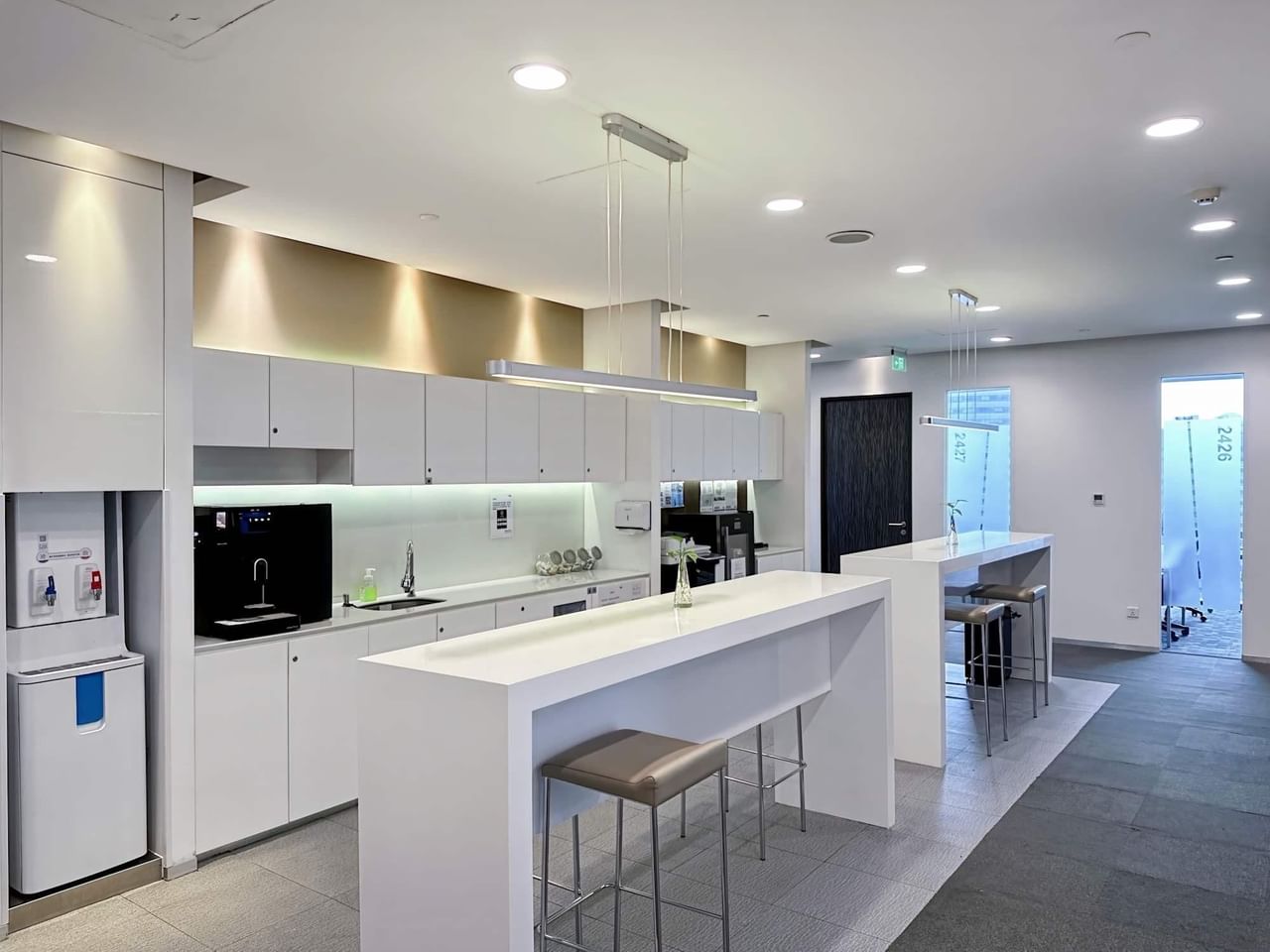 Impressione clientes e colegas em espaços de trabalho com interiores de design elegante que oferecem vistas deslumbrantes a partir do 24º andar.