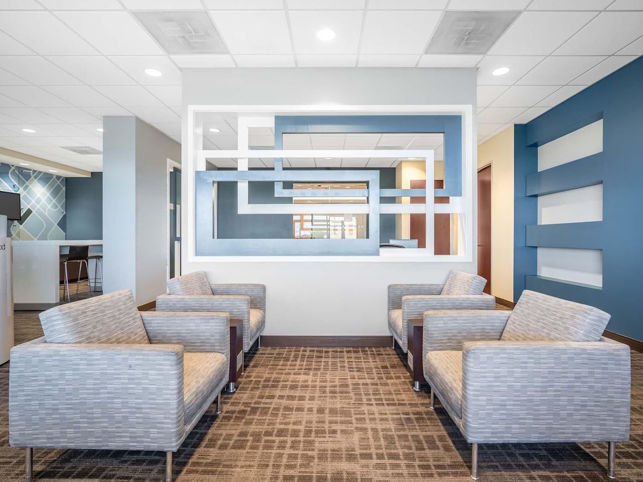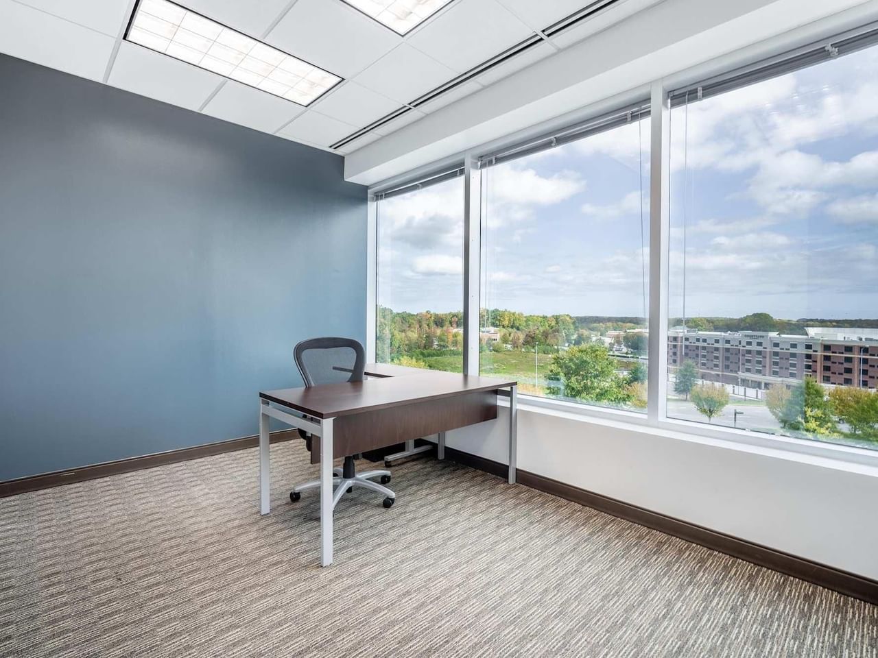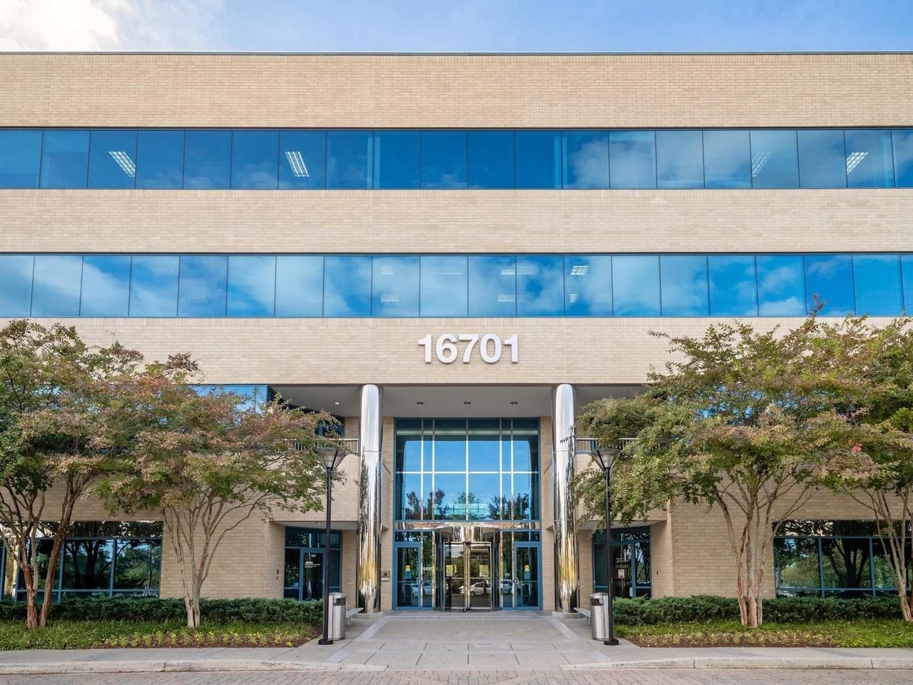 Este impressionante edifício de vidro azul e tijolo está localizado num parque empresarial perto do centro de Bowie.