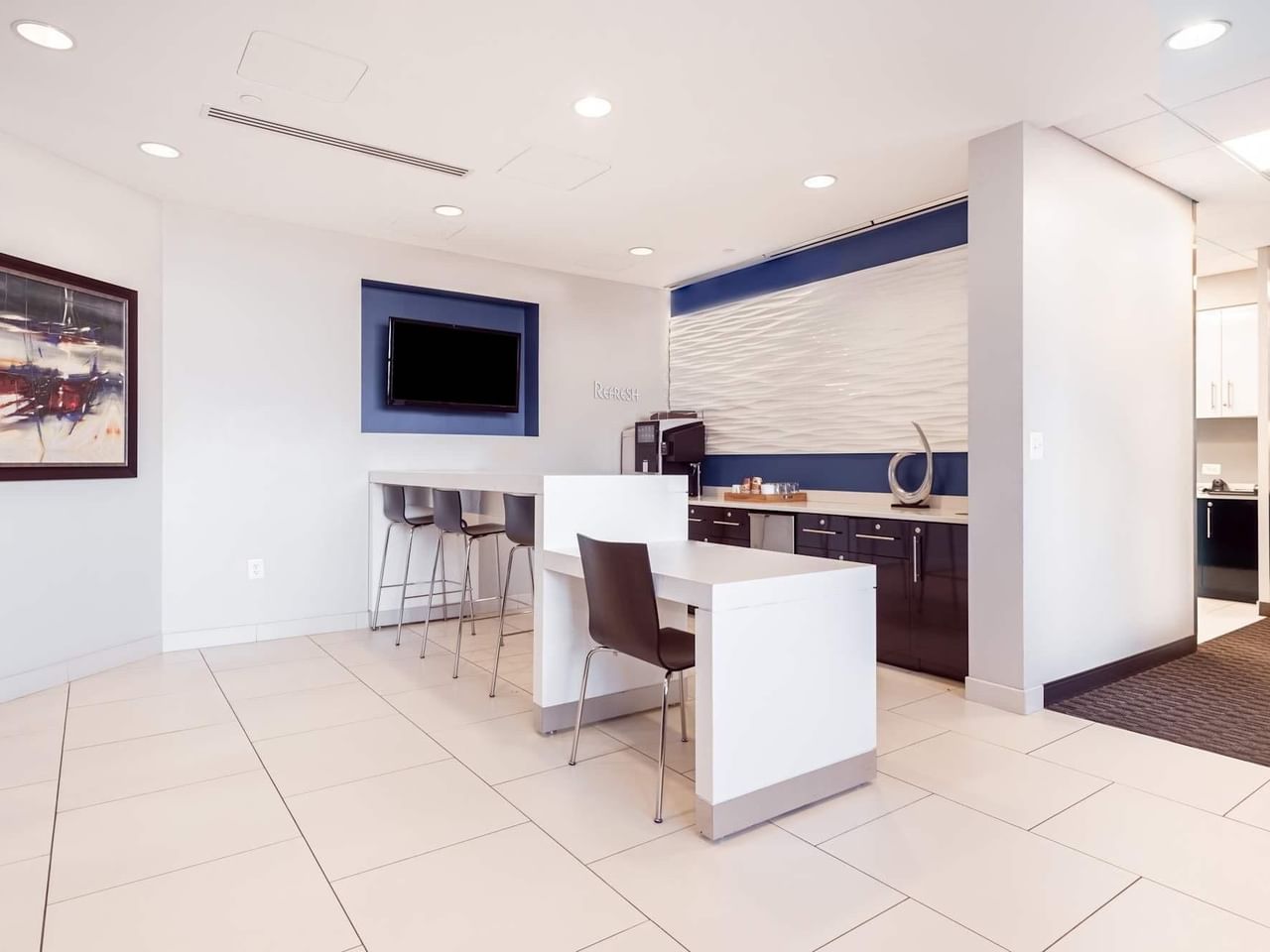 O edifício apresenta um interior moderno, de inspiração marítima, que cria um ambiente fresco e luminoso, com grandes janelas que proporcionam muita luz natural e vistas sobre Washington D.