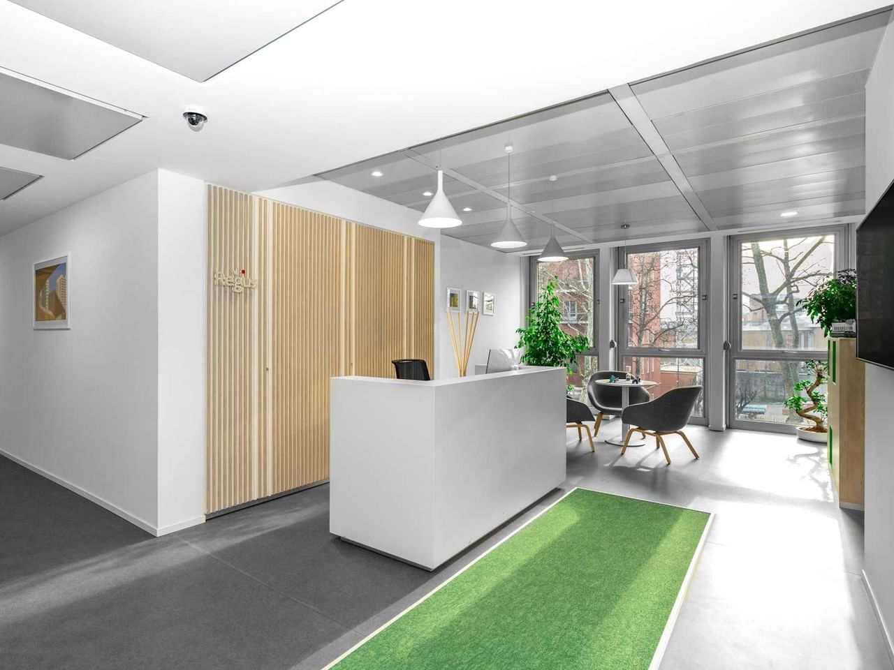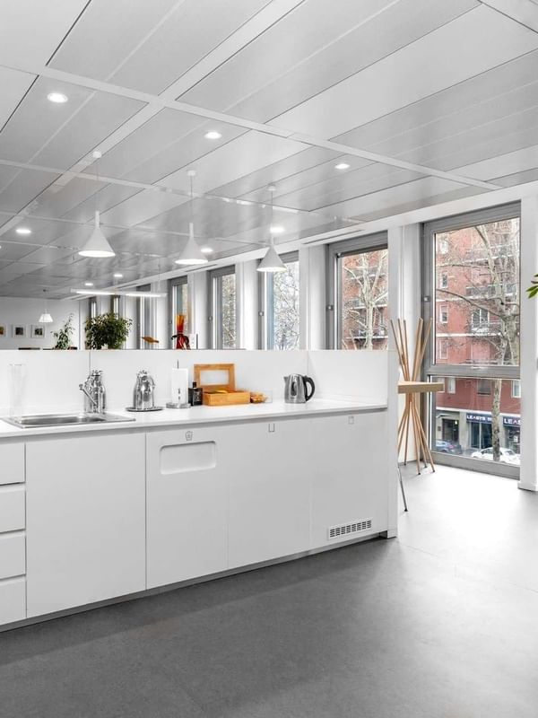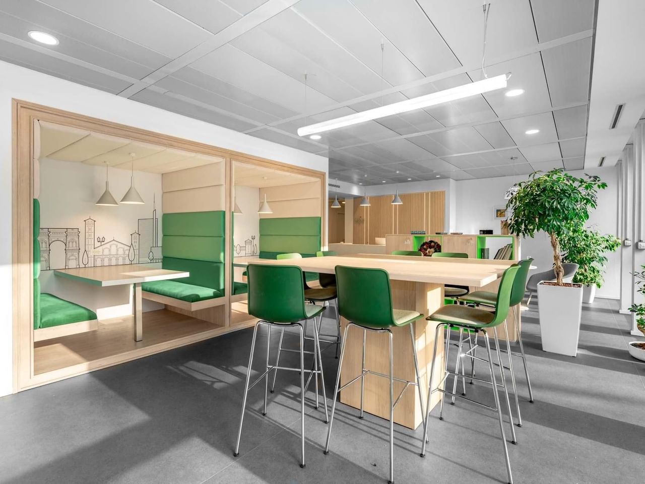 Trabalhe com muita luz natural neste espaço de trabalho moderno e luminoso, com toques de verde que ecoam os belos parques de Milão.