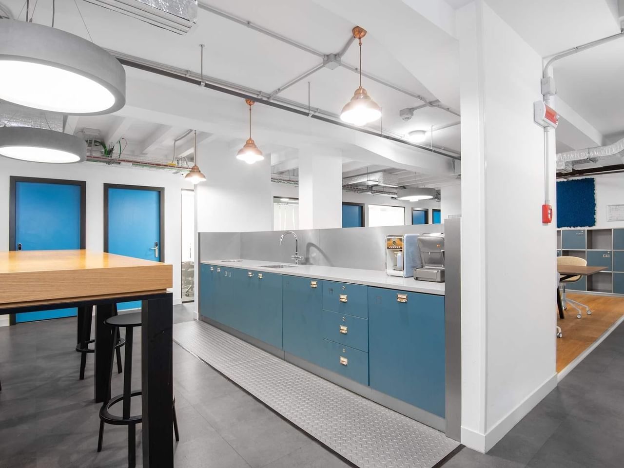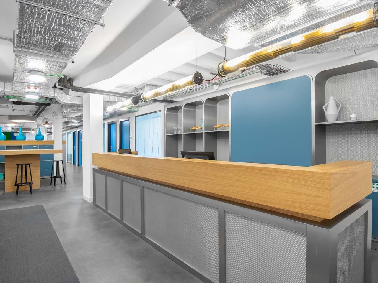 Impressione os clientes com a acolhedora área de receção do edifício e trabalhe de forma calma e eficiente no tranquilo esquema de cores azul dos nossos escritórios cheios de luz.