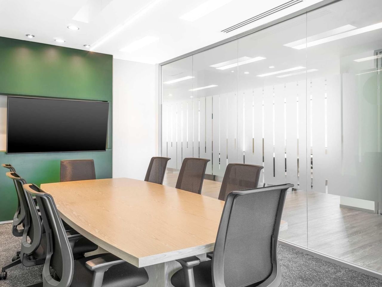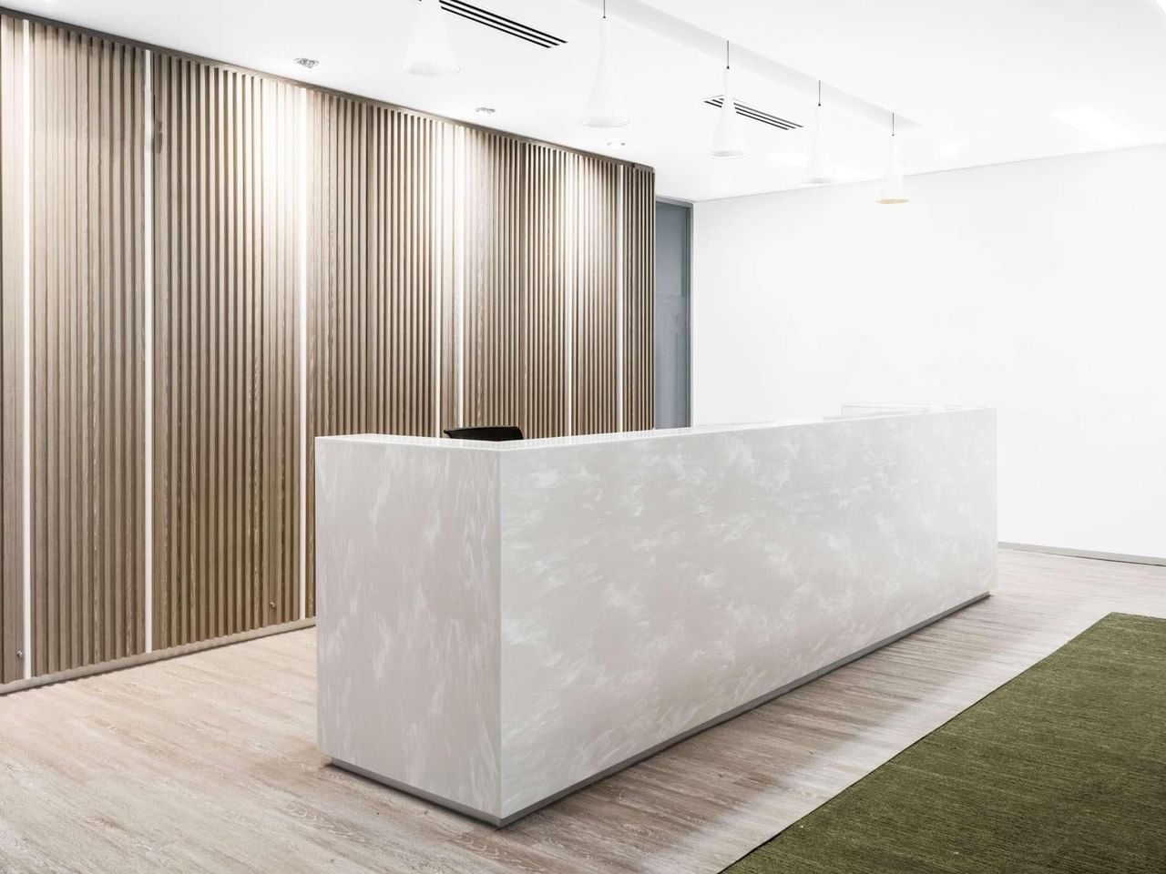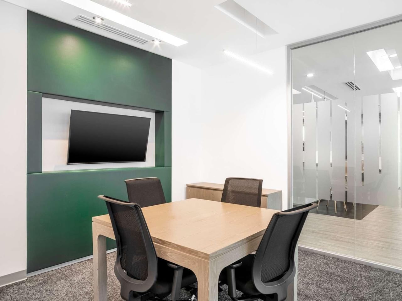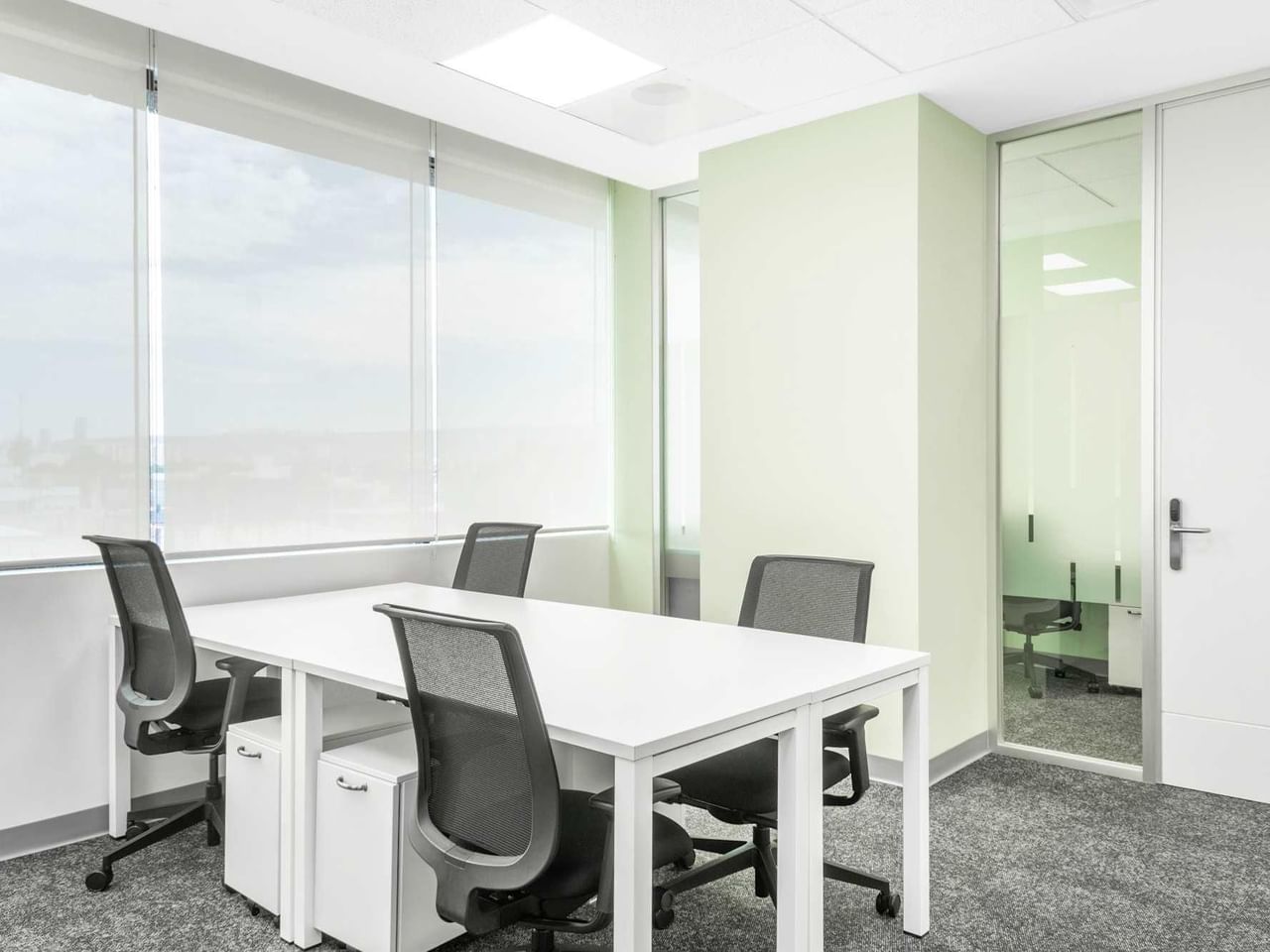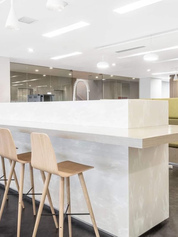 Trabalhe no seu melhor em interiores cheios de luz com toques calmantes de decoração verde e mobiliário elegante.